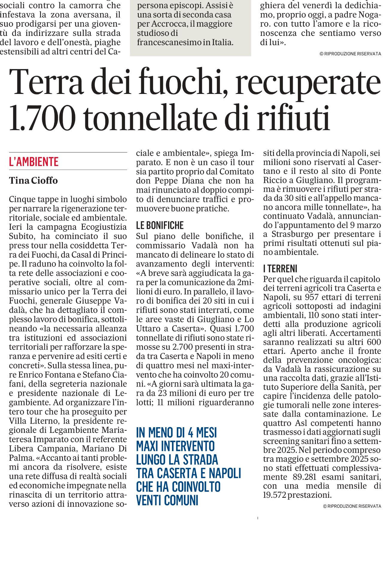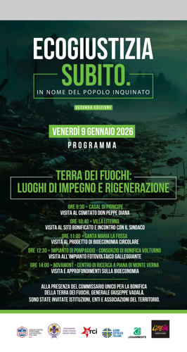 Casal di Principe (CE), 9 gennaio 2026 - “ECOGIUSTIZIA SUBITO. IN NOME DEL POPOLO INQUINATO” è il nome dell’evento, giunto alla seconda edizione, svoltosi presso Casa Don Diana nella mattinata odierna a cui ha partecipato il Commissario Unico per la Bonifica Gen. D. CC Giuseppe Vadalà.