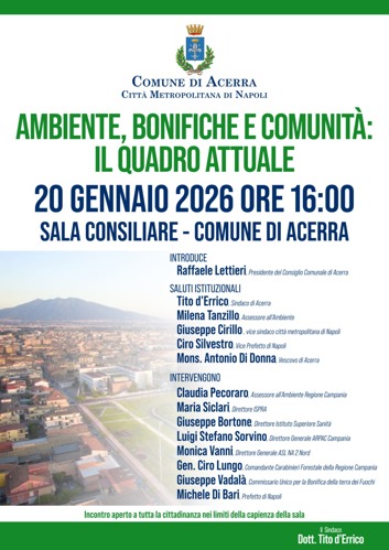 Il convegno pubblico ad Acerra è sul tema "Ambiente, bonifiche e comunità: il quadro attuale", con la partecipazione di vari rappresentanti istituzionali locali e regionali.