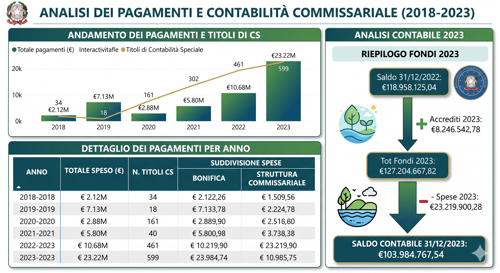 Nota Tecnica: La struttura commissariale opera con un sistema di compenso legato ai risultati (parte fissa e variabile), finanziato dai quadri economici degli interventi stessi, garantendo un'azione orientata all'efficacia e al risparmio erariale (riduzione delle sanzioni UE).